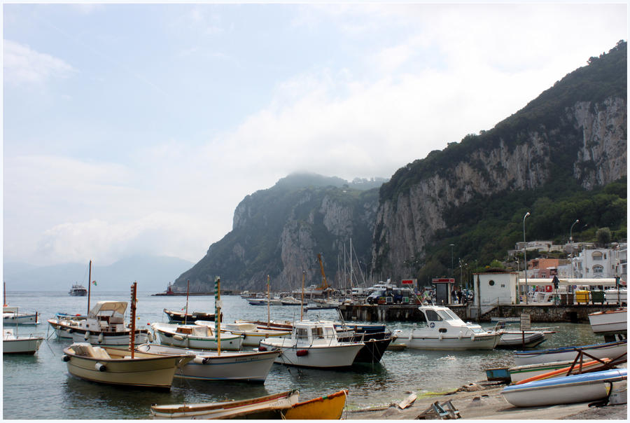 Our first shore excursion, Capri! It started off wet. And cold. A front had gone through, and the cloud was hovering over the highest point of Capri. The ship anchored out of the harbor, and we hopped aboard tenders straight to the Blue Grotto. Along the way, the tour guide gave us an amusing overview of "Boar Island", and I wasn't sure just what we were really going to get to see on a cloudy day in the grotto. From our larger tender boat, we jumped into smaller row boats in groups of four for an intimate ride through a very small hole in the cliff wall. We all had to lie down in the boat to get through, but wow! The water lit up underneath like a giant neon light. The rowers entertained us with song as we ogled the glowing water.