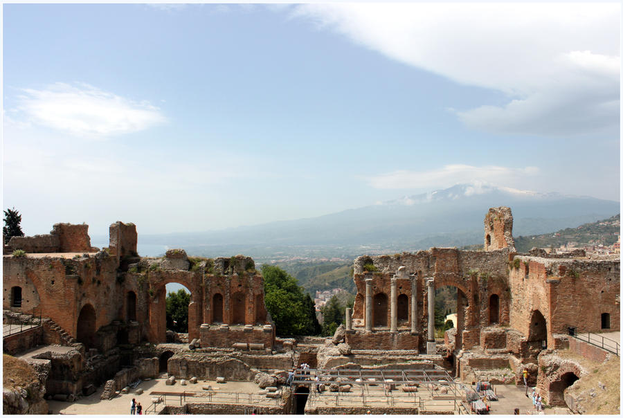 Ah, Sicily! The day was much more pleasant, weather-wise, but there was some frustration with how much time we had. The port of Messina isn't terribly interesting as most of the city was rebuilt after a 1908 earthquake, so we took another tour that required a bus ride to Taormina, about 30 miles south. The city of Taormina is beautiful with views of the coast from its mountainous location with Mt. Etna (the tallest volcano in Europe, and quite active) in the background. The bus brought us to the south end of the main street, which we walked to get to the north end where the ancient Greek theatre is located. The theatre was retrofitted by the Romans to be an amphitheater, so it has a mix of stone and brick infrastructure. While sitting down to hear its history, one found it difficult to take their eyes off the mountain in the distance.