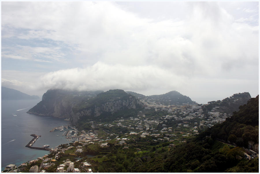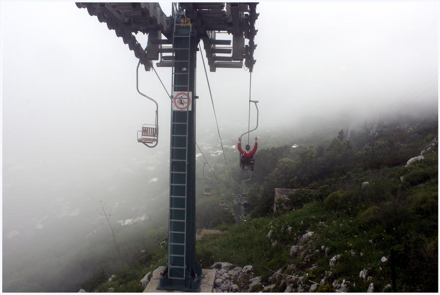 The tenders then took us to the main port of Marina Grande, and a bus weaved us up to the town of Anacapri. We sat for a while to do a wine tasting that Herr thought was "okay", but we both agree the bruschetta was tasty. From there we got tickets to ride a single-seat chair lift to the tippy top of Solaro Mountain. The ride was a unique and peaceful experience that took a little over ten minutes dangling in the air to reach our destination that sat in a cloud. Despite not getting the view from the top, the ride itself was worth doing.