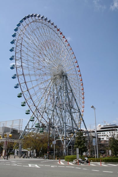 With only seventy pictures left on the two gigabyte memory card, we took a ride on the 123.5 meter high ferris wheel for seven hundred yen a person. Osaka was hazy, so we couldn’t see very far, but we did spot the Akashi Kaikyo bridge in Kobe. Herr tried to rock the cabin a few times which was not cool. It moved slowly so no stopping was necessary to get on or off.
