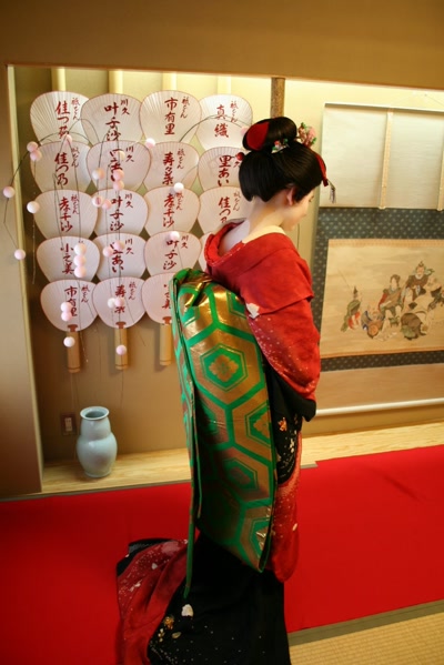 I found this particularly difficult because I was uncertain what color would work for me. Blue, deep dark blue, light green, or bright red. I chose the bright red to balance my new deep red lips, and because it was a strong color. I kind of wish I chose green, so my eyes didn’t get lost. Dressing took many layers. Long hard shoulder straps were the base of the neckline. Another red shift was added, tied up to my chest area. A plate was tied around my midsection at some point — either right before the kimono or right after — to help shape the obi (sash). I only had two color choices, green or blue, so I chose the more subdued green and gold. A bit like Christmas I suppose.