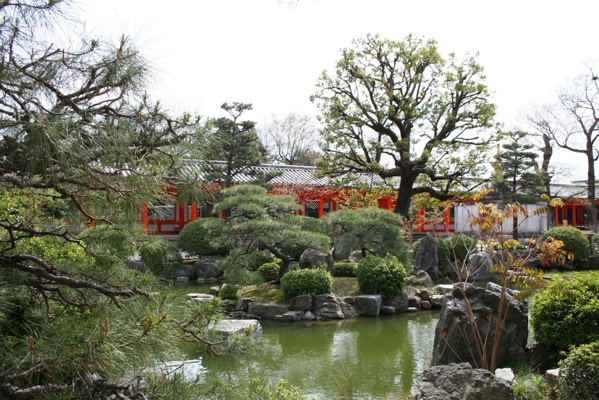 We found Sanju-sangendoa small eatery for breakfast and ate something similar to spaghetti. Sanju-sangendo, the temple with a thousand and one kannons was just a few blocks away. The wind blew from the north and was very strong; I was shivering when we entered the temple complex. We paid five hundred yen each. Around the main building pictures were okay, but no photography was allowed inside.