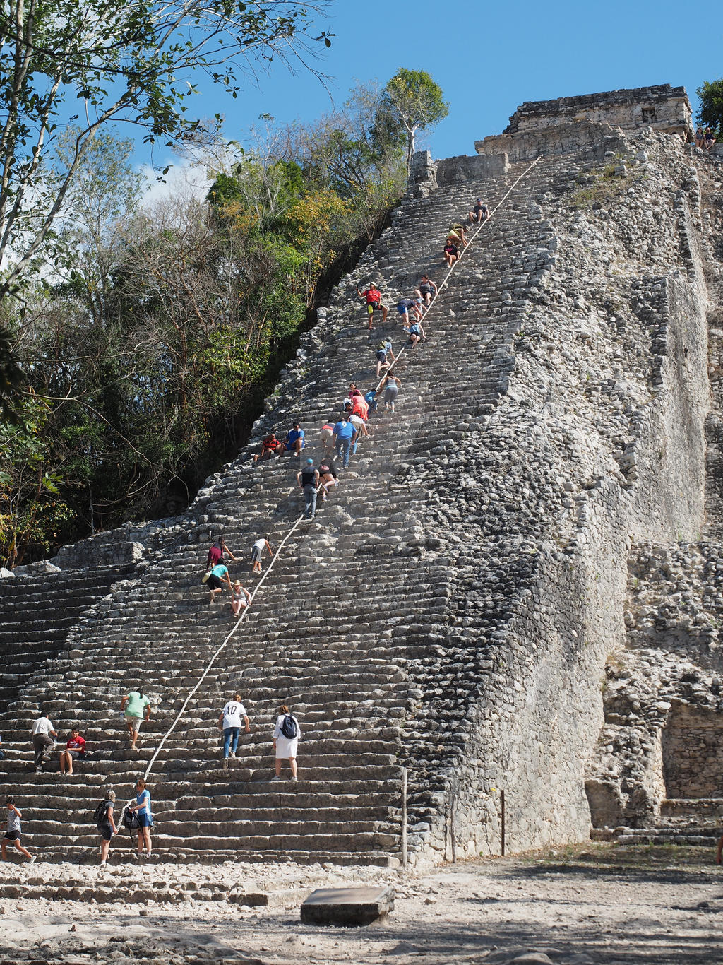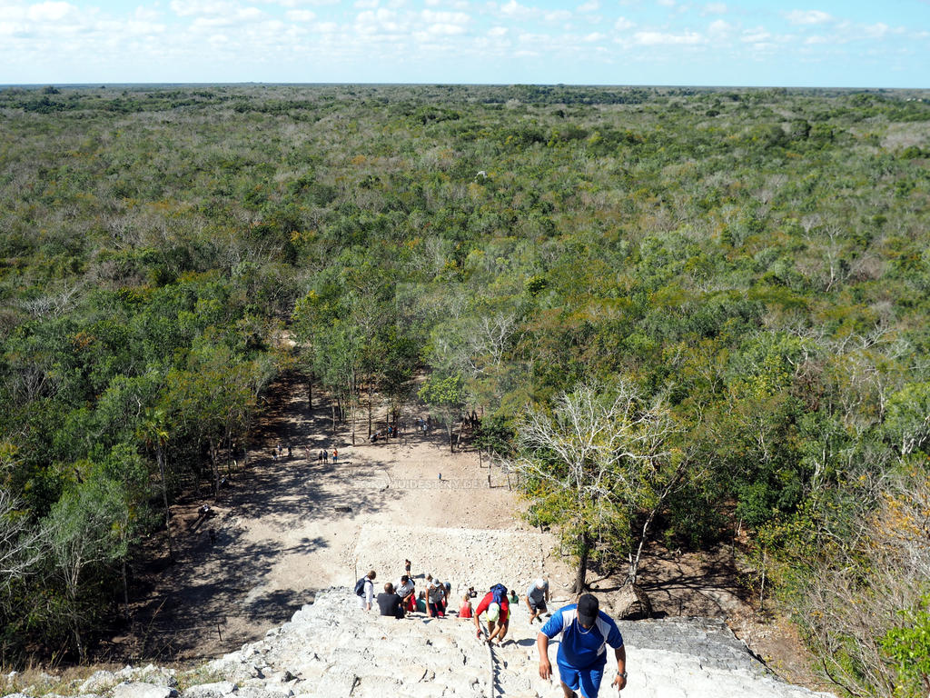 Once to the top of the 120 stair climb, the view was fantastic. Coba's Nohoch Mul Pyramid sits well above the forest canopy cresting a road sightline. A great panoramic picture opportunity. We stayed long enough to cool down and catch our breaths. The walk down was scarier, the slippery stone feeling even more precarious with gravity working with us. Despite the danger, I am glad the experience is still available, unlike at Chichen Itza (we were told its temples were no longer available because of a tourist falling to their death).