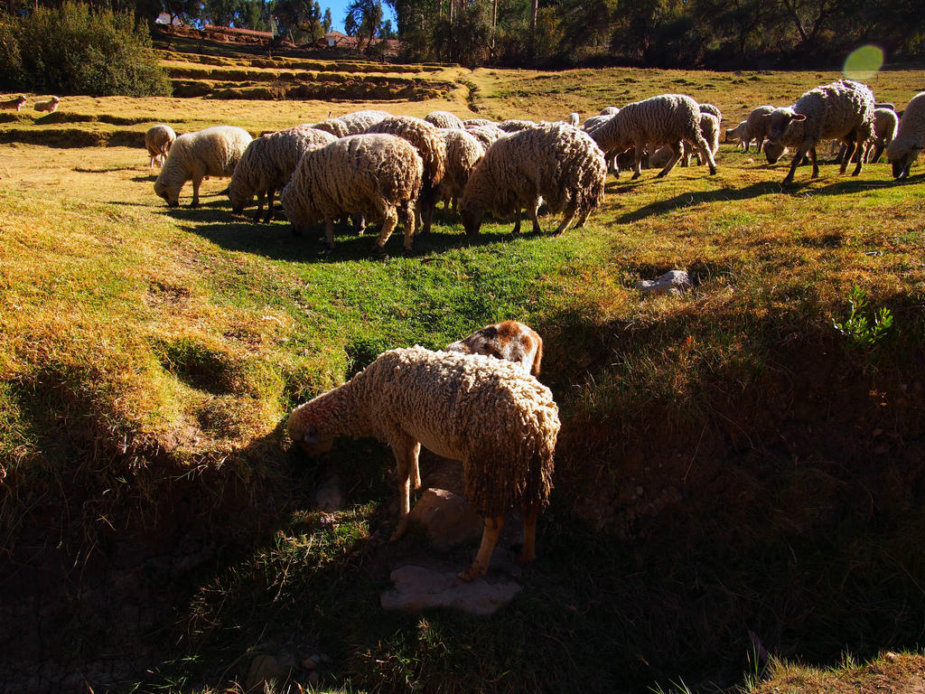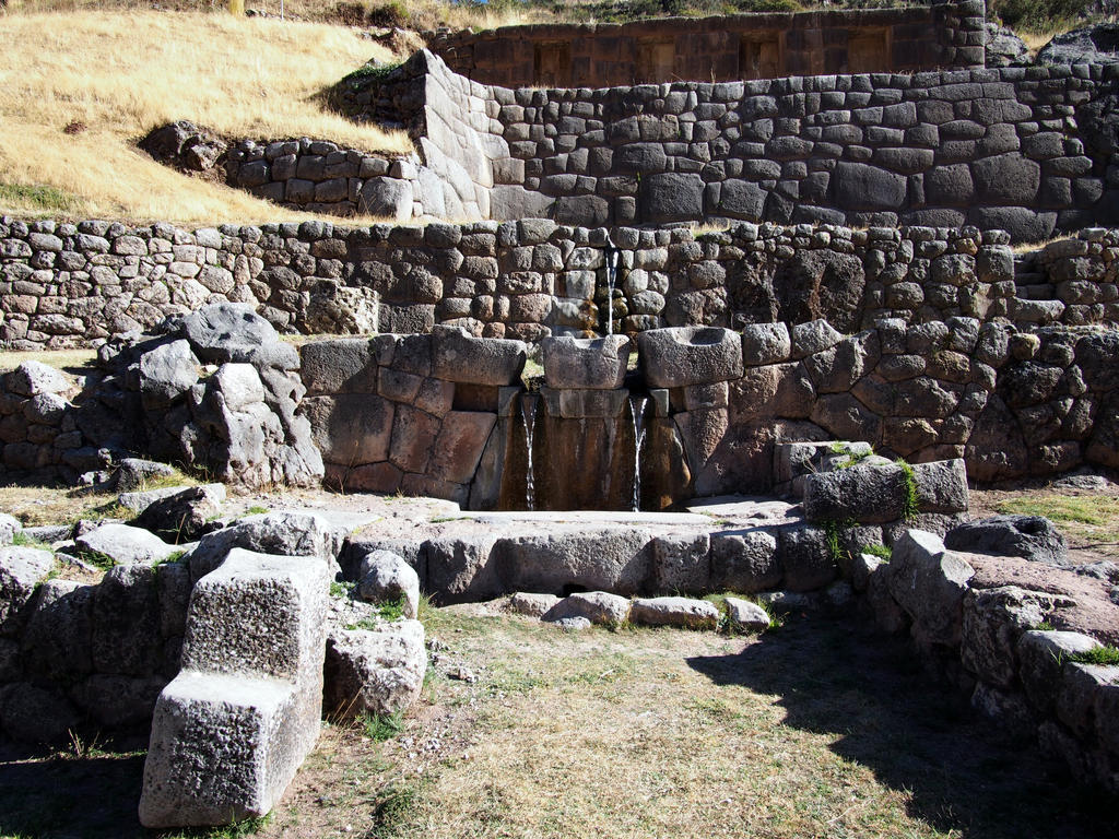 The van we hired had mechanical troubles, so we ended up in two taxis from that point. I was experiencing soroche (altitude sickness) strongly by this point, my head swimming in lightheadedness and shortness of breath (taking a lot of extra breaths to make up for the loss). Our next stop was a large rock that was carved into to make a "hospital" space. Our next stop was Tambomachay, a water temple with small aqueducts and more stone work but much smaller than the other locations. On the way back to Cusco city we stopped by a textile shop to get a short lesson in the different types of animals sheared and the quality. Across the road, locals flew colorful kites up in the hilly peaks of the Andes.