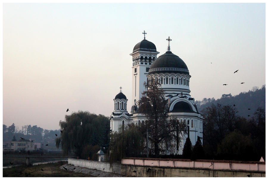 We had an hour and a half to wander around the shopping area, big square, and the adjoining Small Square. I had ice cream, which was pretty tasty. I still liked the ice cream in Rome the most though. The drive back to Bucharest is a long one from Sibiu, so we pulled over at a monastery along the Olt River for a break and some beautiful scenery with the autumn tree-lined hills on the other riverbank.